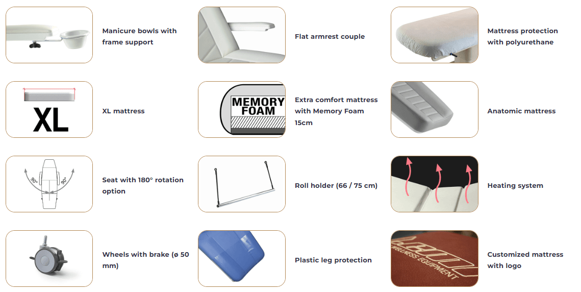 מתאימה במיוחד עבור: עיסויים, טיפולי פנים וגוף, הסרת שיער וטיפולים עם ציוד אסתטי.